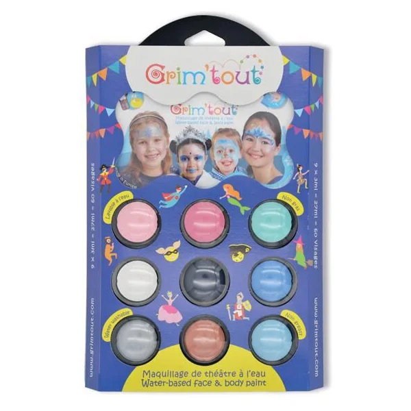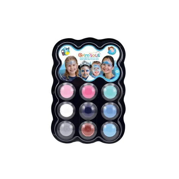 GRIM’TOUT est un maquillage non gras à l’eau de qualité spécialement conçu pour convenir aux peaux délicates des enfants. Toujours dilué à l’eau, il s’applique simplement à l’aide d’une éponge ou d’un pinceau ! Démaquillage aisé à l’eau et au savon. Qualité professionnelle et conformité aux normes cosmétiques. Les palettes 9 couleurs thématiques sont très appréciées pour les supports d’animation de groupe et soirées à thème. 9 teintes x 4 ml.