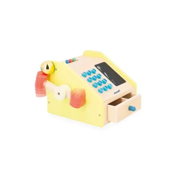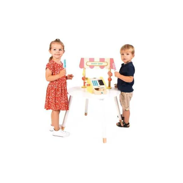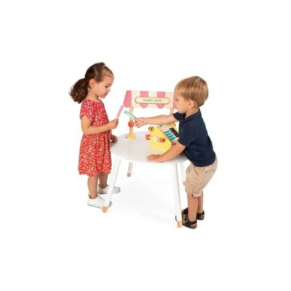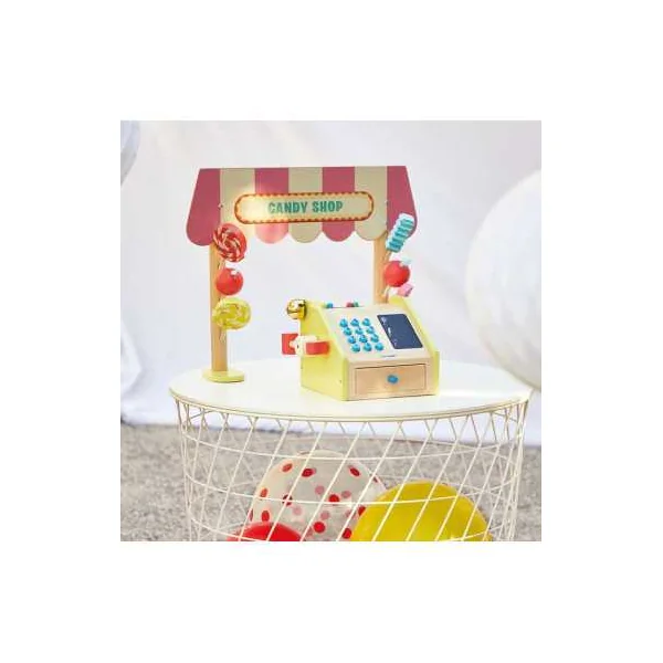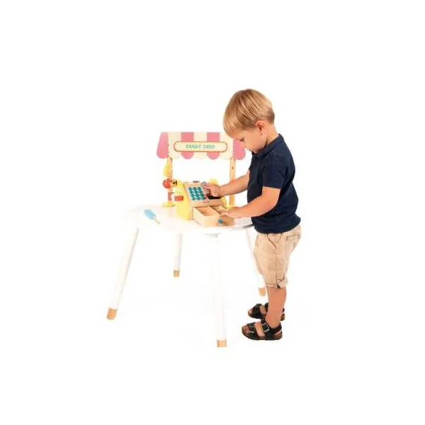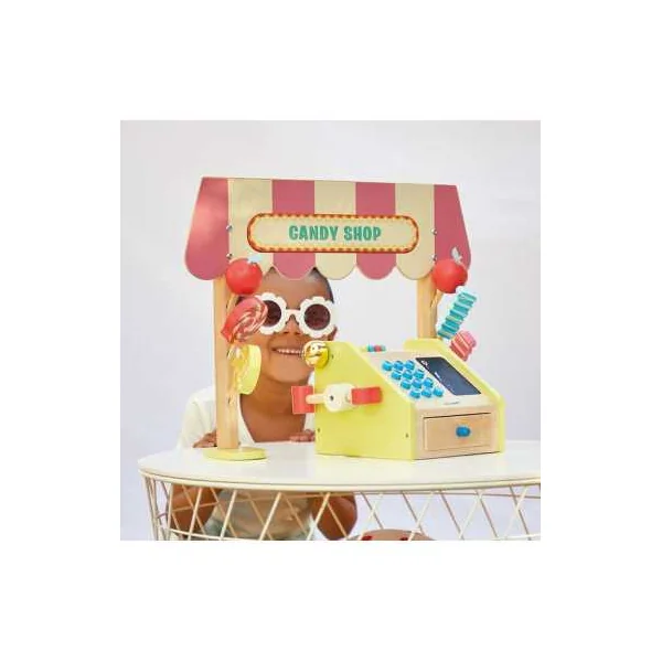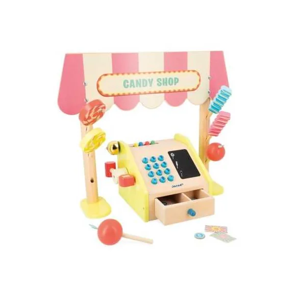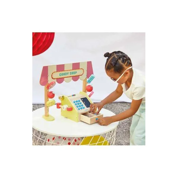Cette marchande est composée d’un fronton en bois, de friandises en bois variées, d’une caisse enregistreuse en bois authentique, de billets en papier, de pièces en carton, ainsi que de deux craies. Les touches ajoutent une sensation réaliste au jeu, tandis que l’espace d’ardoise sur la caisse enregistreuse permet aux enfants d’écrire librement. La fermeture du tiroir actionne le marteau qui fait sonner la cloche, ce qui ajoute une touche réaliste à l’expérience de jeu.