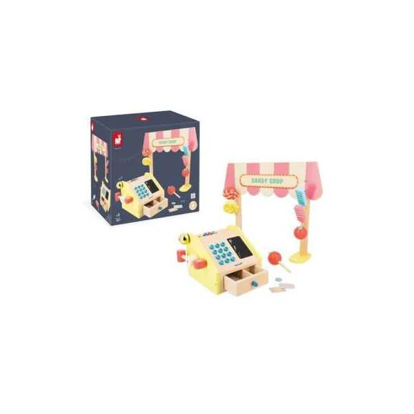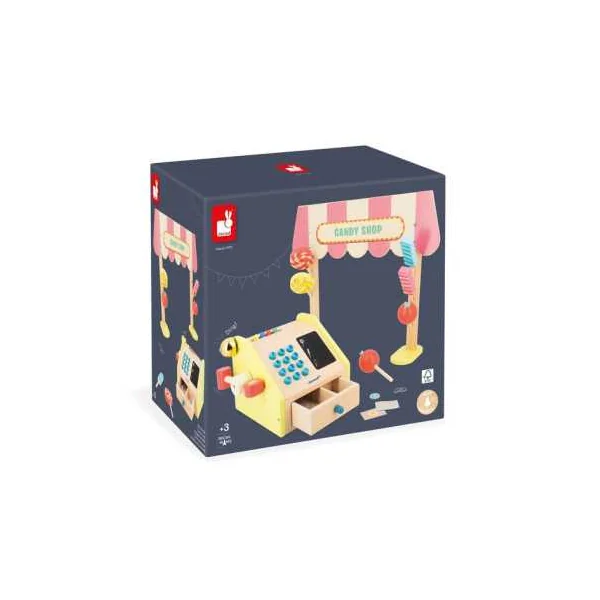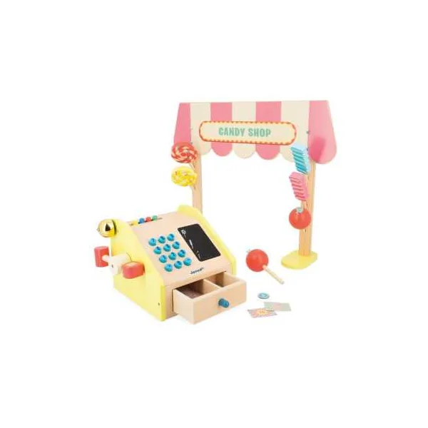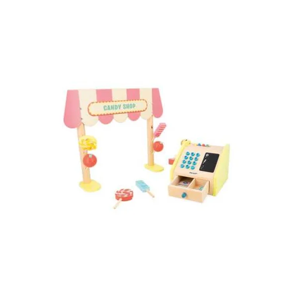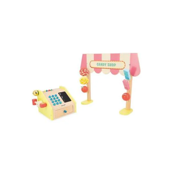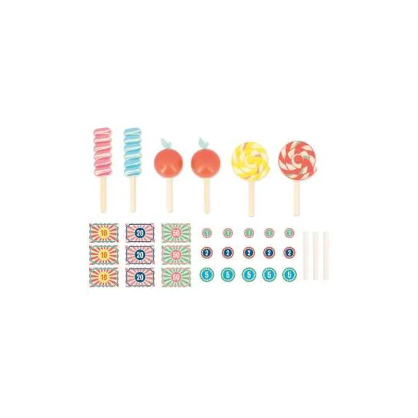 Le coffret comprend 1 fronton en bois, 6 friandises (2 x 3 modèles) en bois, 1 caisse enregistreuse en bois, 9 billets en papier, 15 pièces en carton et 2 craies.