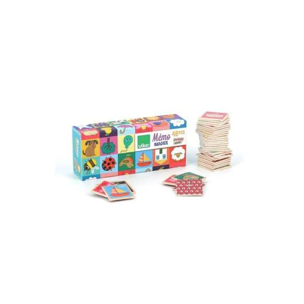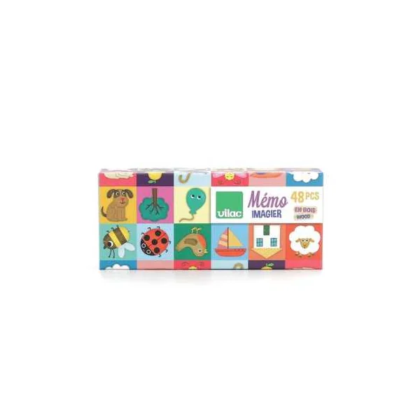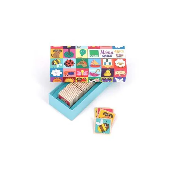Découvrez le jeu Mémo 48 pièces en bois de Vilac illustré par Mélusine Allirol, un jeu éducatif avec 24 paires à reconstituer à partir de 2 ans avec de splendides illustrations.