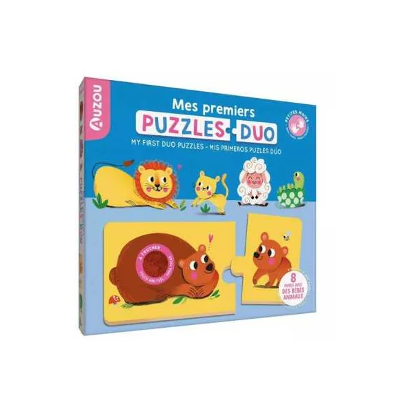 Découvrez Mes premiers puzzle duo à toucher de Auzou, un coffret cadeau pour les enfants à partir de 2 ans avec 8 puzzles de 2 pièces avec des matières à toucher.