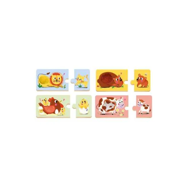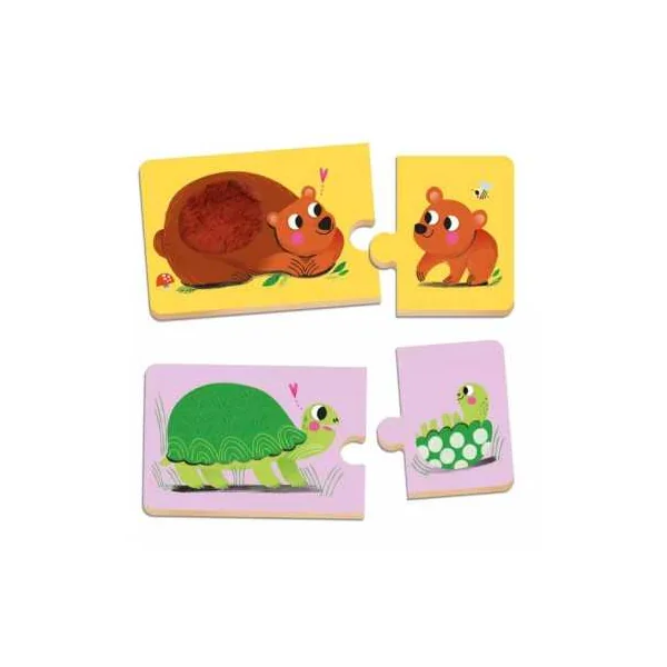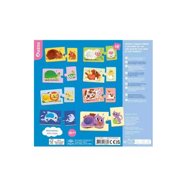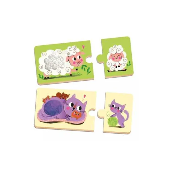 L’enfant associe un animal adulte avec son bébé. Les puzzles duo proposent 8 matières à toucher pour éveiller les sens du petit.