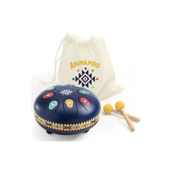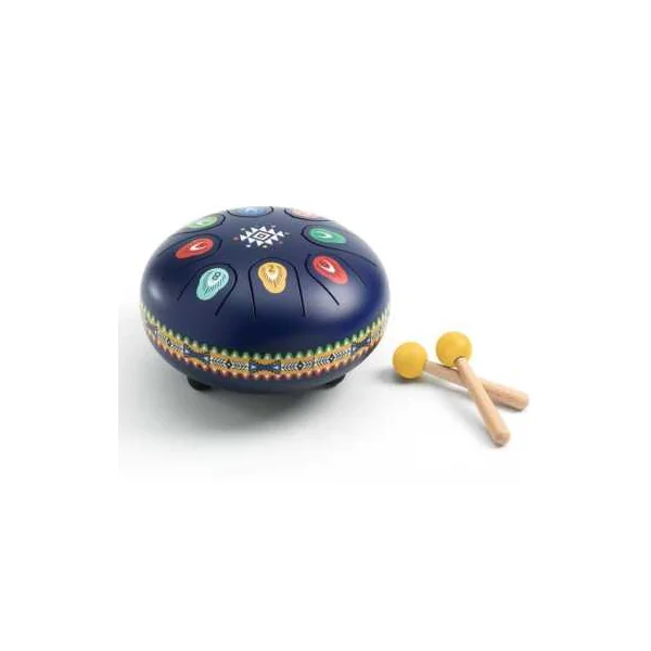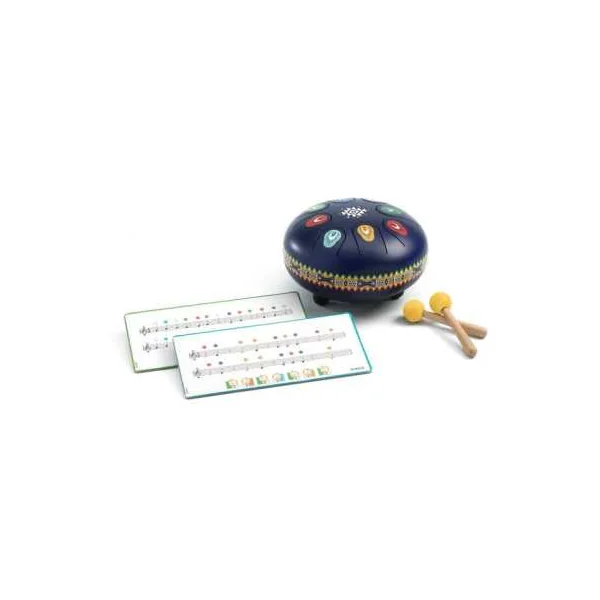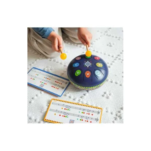 Ce tambour en acier est un instrument à percussion doté de 8 languettes, chacune correspondant à une note de musique. Facile et intuitif à jouer, l’enfant peut créer ou reproduire des mélodies apaisantes en frappant les languettes avec les baguettes fournies.