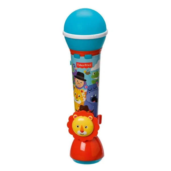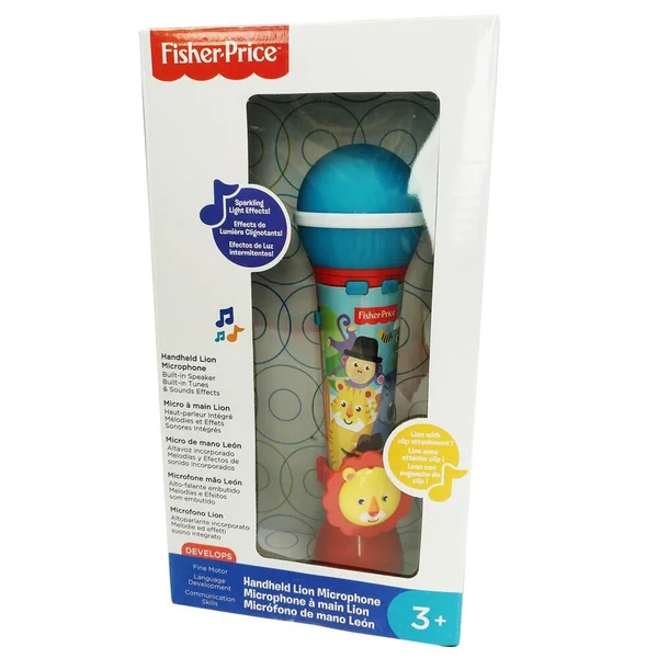 Microphone avec haut-parleur intégré. Avec mélodies et effets sonores : un bouton te permet de déclencher 2 mélodies et des applaudissements. Effets lumineux : lumières clignotantes en appuyant sur un autre bouton. Lion avec attache clip. Interrupteur on/off. Notice incluse. En plastique. Licence : Fisher Price.