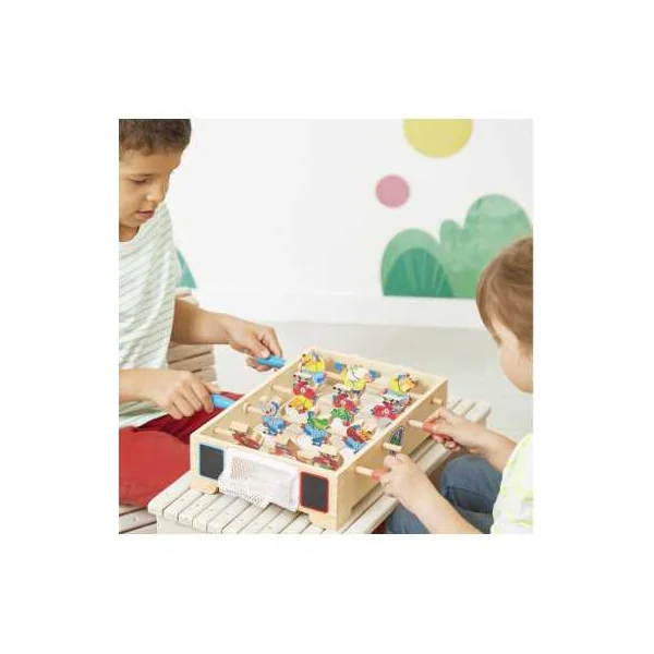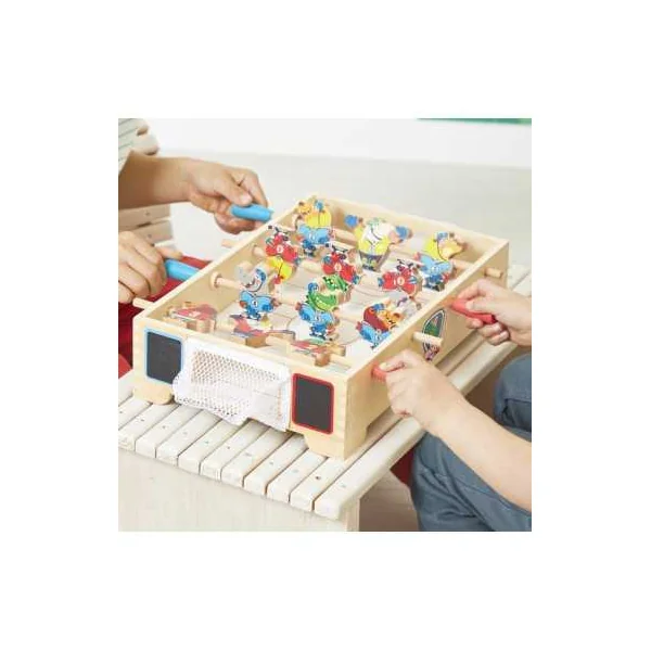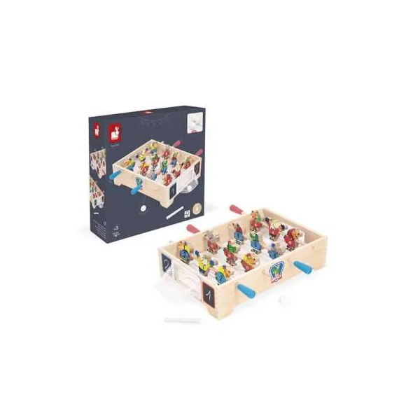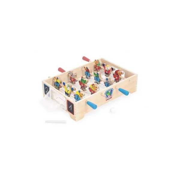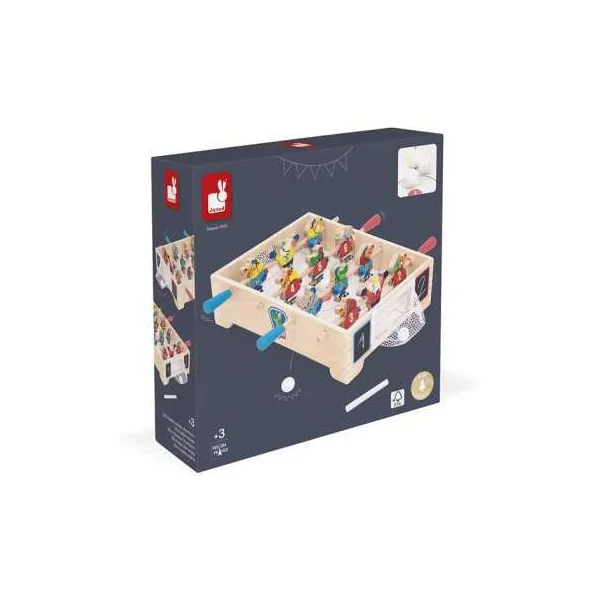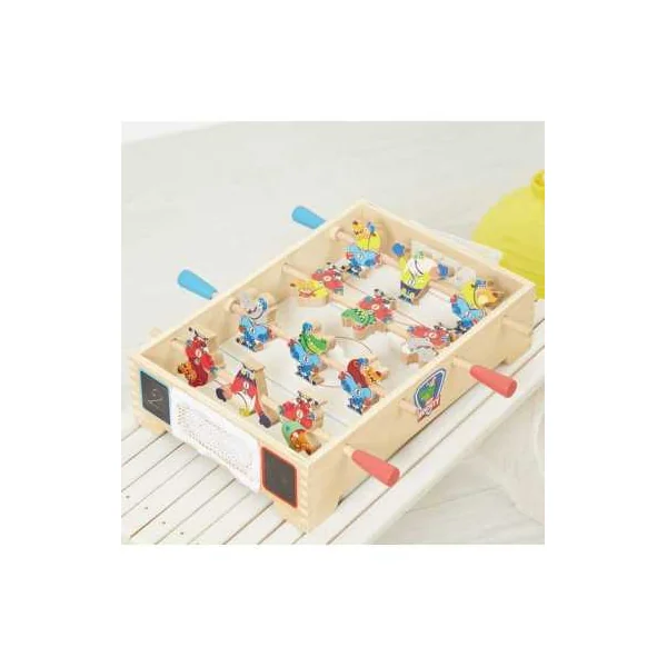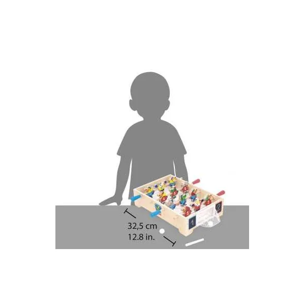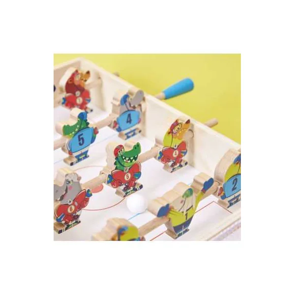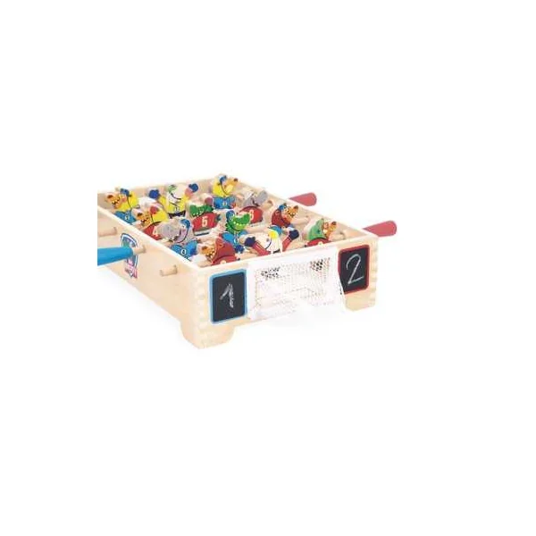 L’objectif est simple : marquer un maximum de buts dans le camp adverse en faisant preuve d’agilité et de rapidité. Ce jeu en bois comprend 12 joueurs en forme d’animaux amusants, des cages amovibles grâce à un système de scratch, 3 balles et une craie pour noter le score.