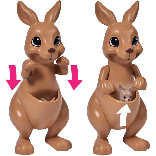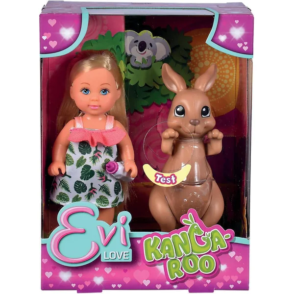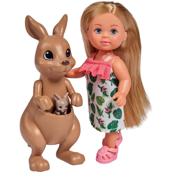 Mini poupée mannequin Evi 12cm en robe. Evi est accompagnée d’une maman kangourou et de son bébé qui sort et rentre dans la poche lorsqu’on actionne la patte de sa maman. Evi possède un biberon pour nourrir le bébé kangourou.