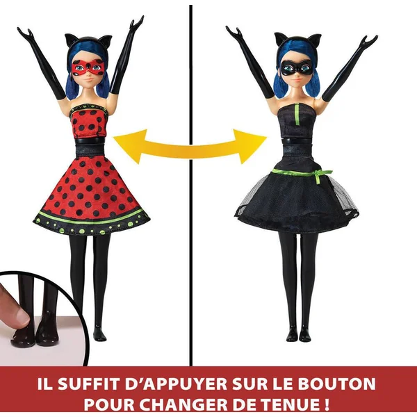 Une seule pression sur le bouton et la poupée changera de tenue toute seule ! Pas besoin de changer ses vêtements soi-même, il suffit d’appuyer sur un bouton et la poupée Ladybug se transforme toute seule ! Fonctionne avec 2 piles AAA (incluses). Ce jouet Miraculous comprend également les masques des 2 personnages, ainsi que les oreilles de chat de Lady Noire. Les cheveux de la poupée sont coiffable.