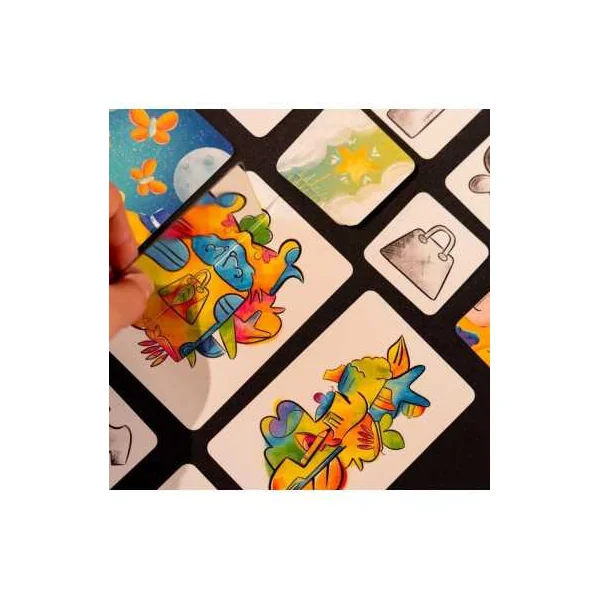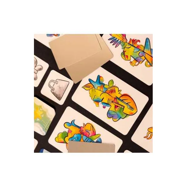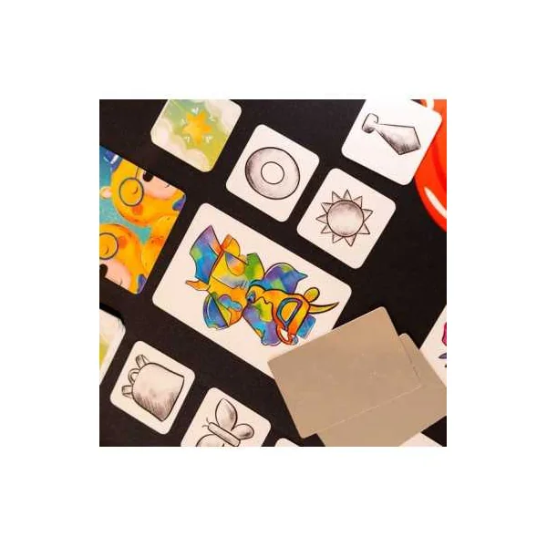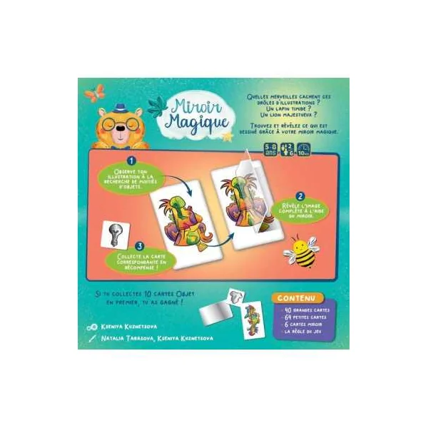 La boite de jeu contient 40 grandes cartes avec une illustration couleur représentant des moitiés d’objets entremêlées, 64 petites cartes avec des objets en noir et blanc, 6 miroirs et la règle du jeu.