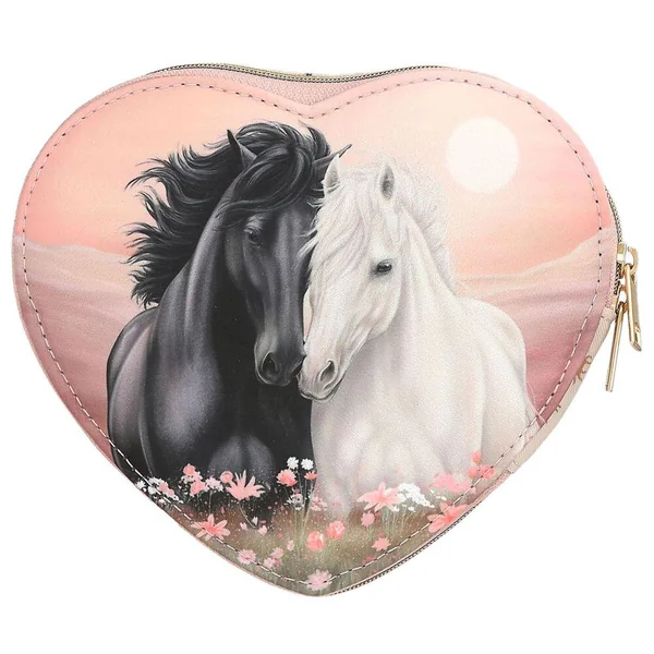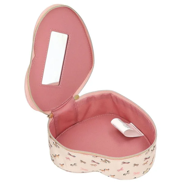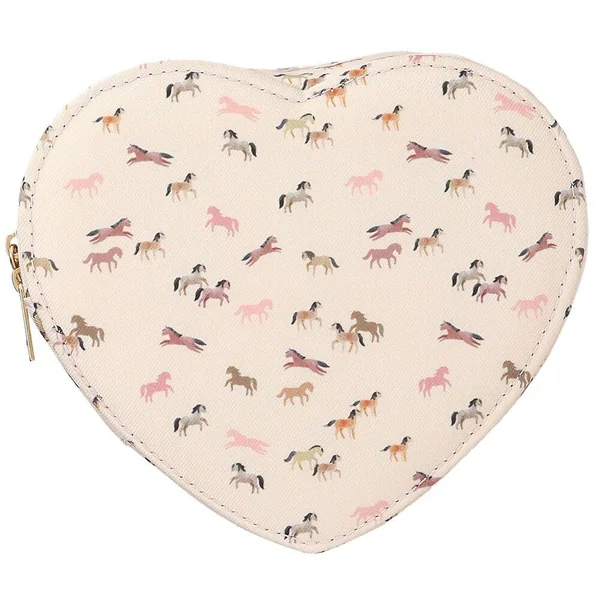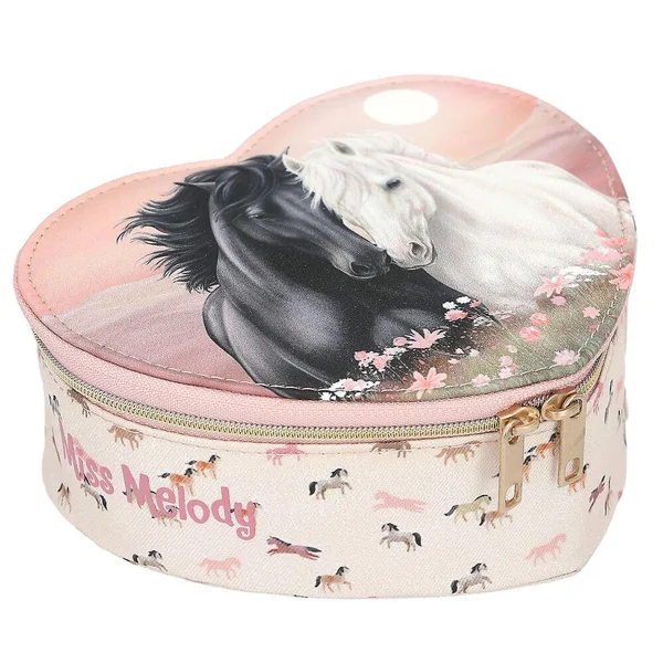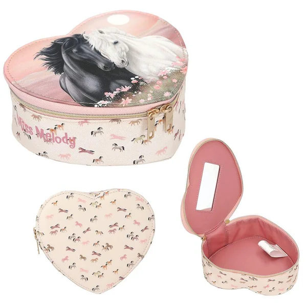 Miss Melody Boîte à bijoux petite BLOSSOM PONYCette boîte à bijoux en forme de cœur de Miss Melody, dans de délicates nuances de rose et ornée d’un motif cheval intime, dispose d’un petit miroir intégré dans son couvercle à charnière avec fermeture éclair. Parsemée de nombreux petits imprimés chevaux. Matière principale : 100 % polyester-