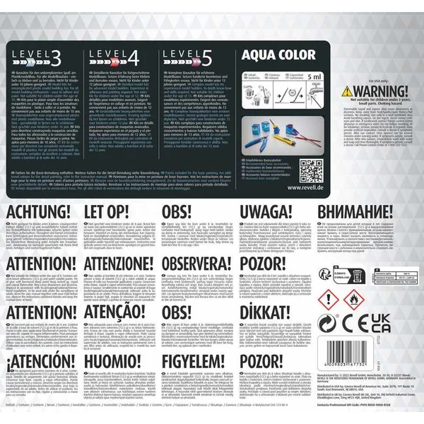 Instructions d’utilisation : Peinture acrylique à base d’eau. Avant utilisation, bien mélanger la peinture. Appliquez avec un pinceau ou par pulvérisation sur une surface sèche et propre. Base non inflammable, sèche rapidement – non colorable après 1 heure, complètement sèche en 2 à 3 heures, selon l’épaisseur de la couche. Si nécessaire, diluez avec de l’eau. L’utilisation d’un diluant inapproprié peut endommager la peinture ! Se nettoie avec le diluant Revell Aqua Color Clean. Pour la pulvérisation, un diluant de 20 à 25 % maximum est recommandé. Rincez le pinceau et les outils immédiatement après utilisation à l’eau. Fermez hermétiquement le récipient après utilisation. Consommez dès que possible après ouverture, la peinture sèche à l’air. Protéger du gel. Contient un mélange de substances 5-chloro-2-méthylisothiazol-3(2H)-one et 2-méthylisothiazol-3(2H)-one avec du chlorure de magnésium et du nitrate de magnésium. Peut provoquer une réaction allergique.