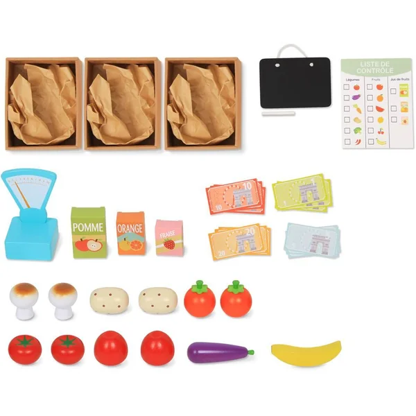 38 pièces au total. Marchande épicerie avec de nombreux accessoires factices dont : des légumes, des fruits, des jus de fruit, une balance, un petit tableau noir, 1 craie et des billets de banque (argent factice). Instructions d’assemblage incluses. Développement de la motricité et de la coordination main/œil. Apprentissage des objets. Léger et facile à manipuler. Matières : bois, papier et polyester.
