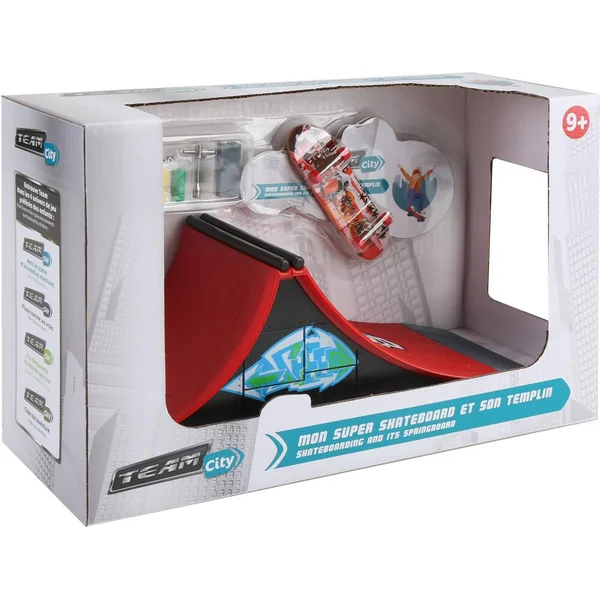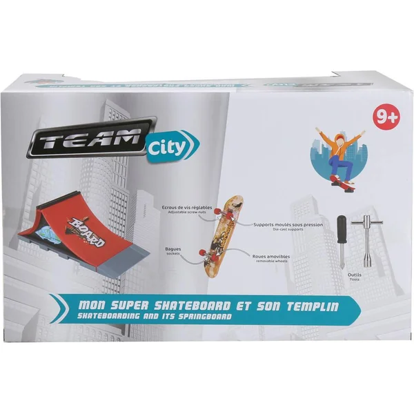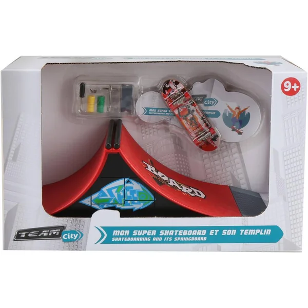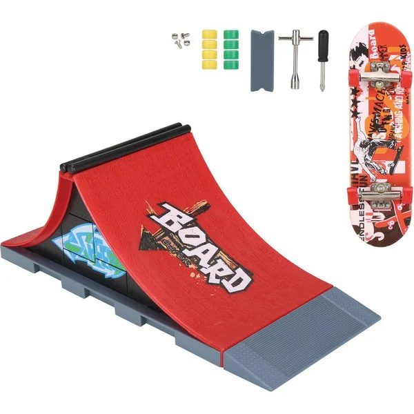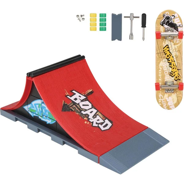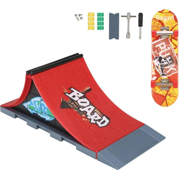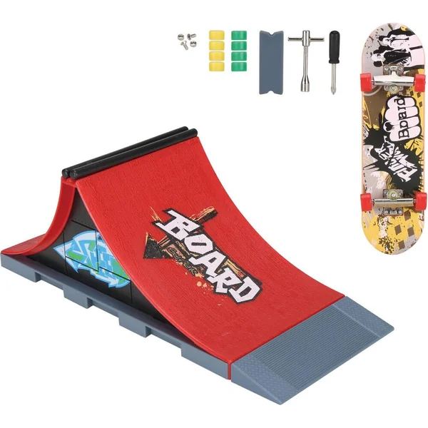 Contient : 1 module de skatepark, 1 mini skateboard, des roues de rechange et des outils (dont 1 tournevis). En métal et plastique.
