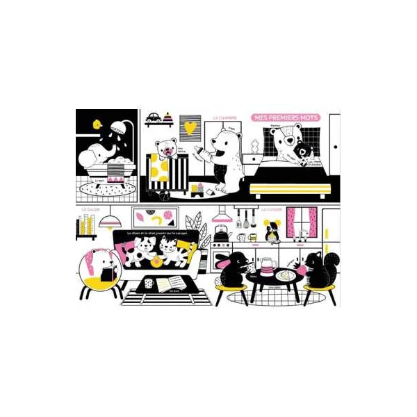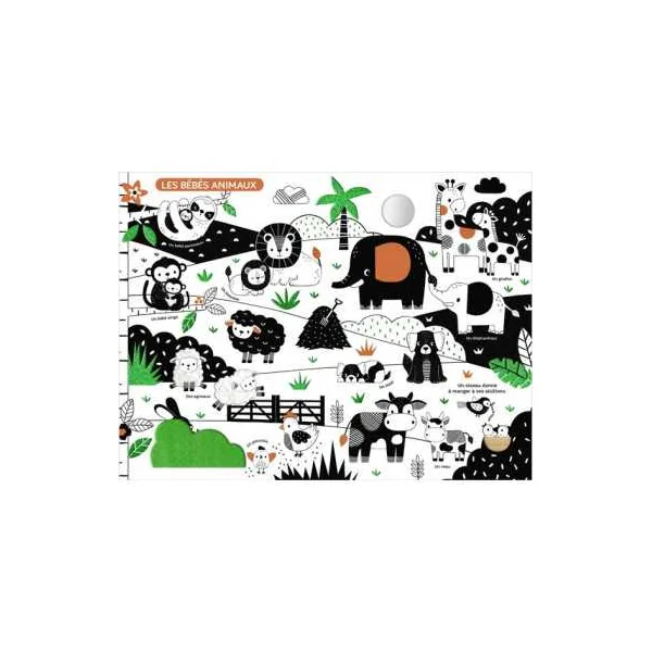 Un magnifique livre au format géant avec plus de 20 matières à toucher au fil des pages et qui peut se transformer en tapis d’éveil. Le tout-petit découvre même un miroir à la fin ! Ce nouveau titre revêt un magnifique design en noir et blanc, avec des touches de couleurs flashy avec 4 tableaux magnifiques à observer !