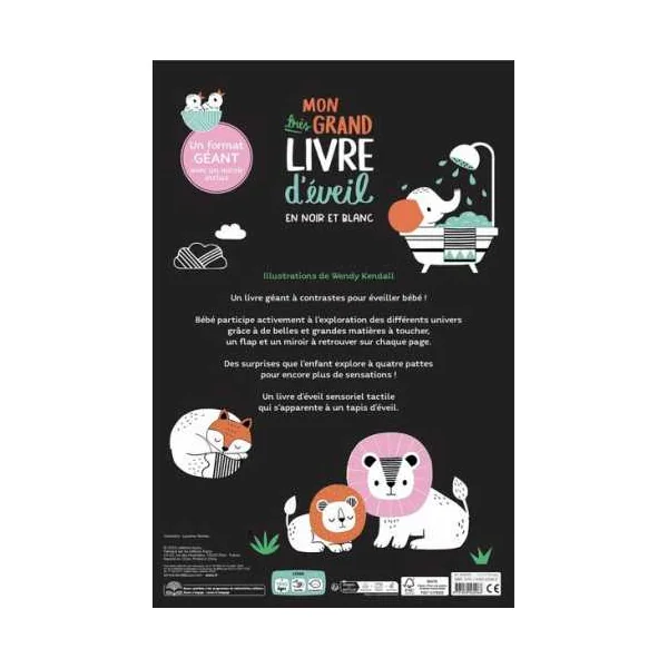 DécouvrezMon très grand livre d’éveil en noir et blanc de Auzou, un livre en carton géantde 8 pages pour les enfants dès le plus jeune âge. Un livre d’éveil géant à toucher et à contempler, illustré par Wendy Kendall.