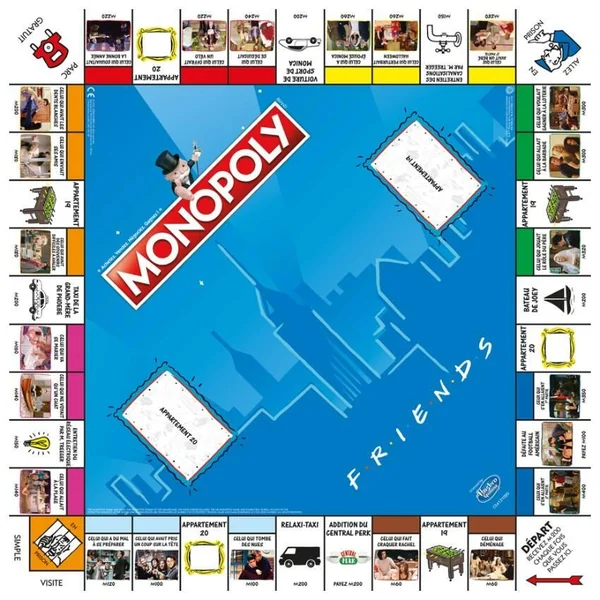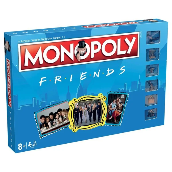 Revivez les meilleurs moments de la myhtique série FRIENDS dans cette édition spéciale du Monopoly. Parcourez le plateau avec le Dinosaure de Ross, la Pizza de Joey, ou encore la guitarre de Phoebe et retrouvez chez vous l’ambiance qui a fait le succès de la célèbre sitcom ! Monopoly FRIENDS : jeu de société où le but est d’être le dernier joueur à ne pas faire faillite. Version française. Edition FRIENDS. Le canapé et les tasses du Central Perk remplacent les traditionnels maisons et hôtels. Contenu : 6 pions de collection en métal + billets, cartes, hôtels et plateau personnalisés. De 2 à 6 joueurs. Durée de la partie : environ 1h30.