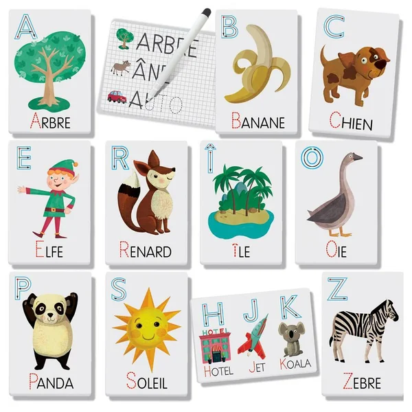 Ces grandes flashcards sont autant de petites ardoises pour apprendre à lire et écrire dès le plus jeune âge. D’un côté les enfants découvrent les phonèmes et les associent à la forme des lettres correspondantes, de l’autre ils s’habituent à écrire en traçant les mots avec le feutre effaçable.Reconnaître les lettres ; Première écriture ; Première lecture ; Motricité fine.