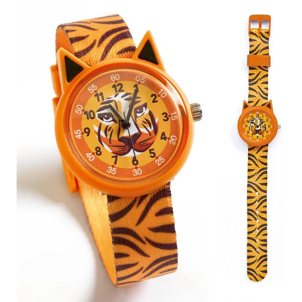 Une montre à quartz élégante sur le thème du tigre pour apprendre à lire l’heure. Une montre pédagogique avec deux cadrans bien distincts (un pour les heures, l’autre pour les minutes) et des aiguilles fines pour faciliter la lecture de l’heure.