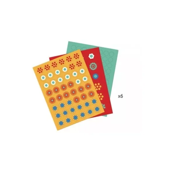 Ce coffret contient 3 planches illustrées silhouettées, environ 300 gommettes rondes de mousse adhésive de 3 diamètres différents et 1 livret explicatif pas à pas.