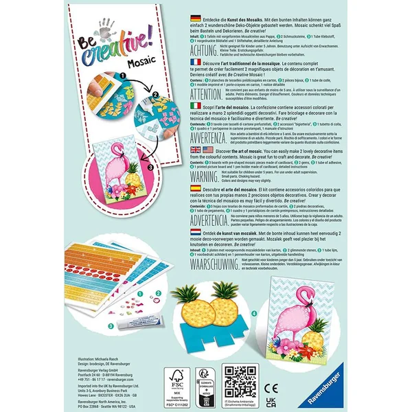 Ce coffret mosaïque permet de créer facilement 2 très beaux objets sur un thème tropical : 1 pot à crayon à 4 compartiments et 1 tableau pré-imprimé de 18 x 26 cm. Loin des écrans, cette activité ludique allie dextérité et précision pour développer l’habilité manuelle et la concentration des enfants. Idéal pour débuter, le coffret comprend tout le nécessaire : des tesselles prédécoupées en forme de carré, trapèze, triangle, cœur, étoile ou nœud, 1 pièce bijou, 1 tube de colle et 1 notice détaillée. Ce produit est composé de matériaux issus de forêts bien gérées certifiées FSC®, de matériaux recyclés et de matériaux issus d’autres sources contrôlées (FSC-C111262).