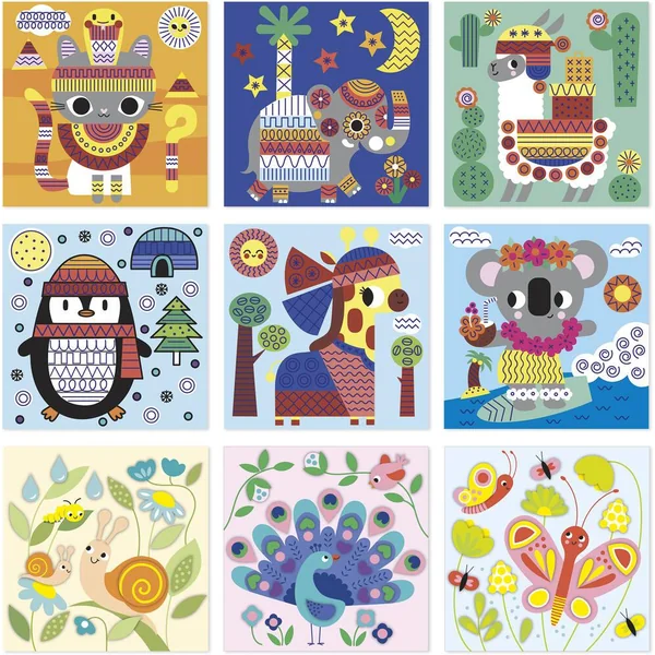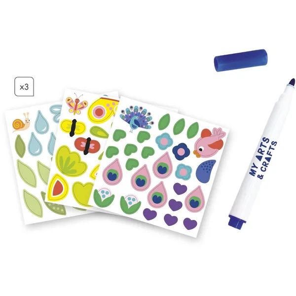 Ce coffret multi activités propose 2 techniques différentes et permet de réaliser 9 créations. Adapté aux apprentissages des enfants de 4 ans, il permet de réaliser 3 tableaux à décorer avec des stickers épais qui donnent un effet de volume spectaculaire, ainsi que 6 tableaux graphismes à colorier compléter avec un feutre effaçable qui permet de recommencer à l’infini ! Il faut environ 1h30 pour compléter les tableaux effaçables et 45 minutes pour les tableaux à stickers. Ce kit permet de développer la motricité fine et la concentration