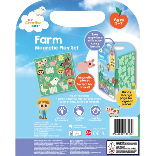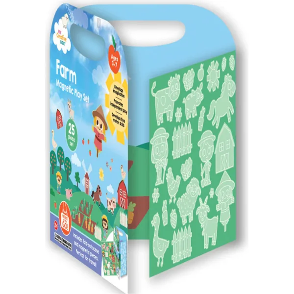 Le set comprend 24 pièces magnétiques, y compris un environnement pliable avec des animaux de la ferme, des fermiers, des cultures et leur environnement, le tout illustré par un artiste local. Il est destiné aux enfants de 3 à 7 ans et offre des heures de créativité, que ce soit à la maison ou en voyage.