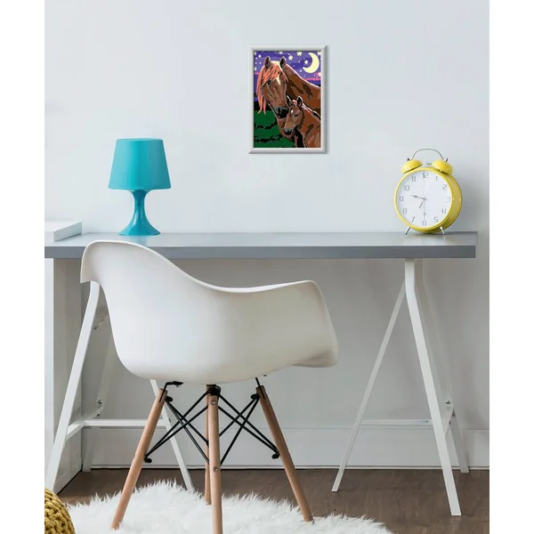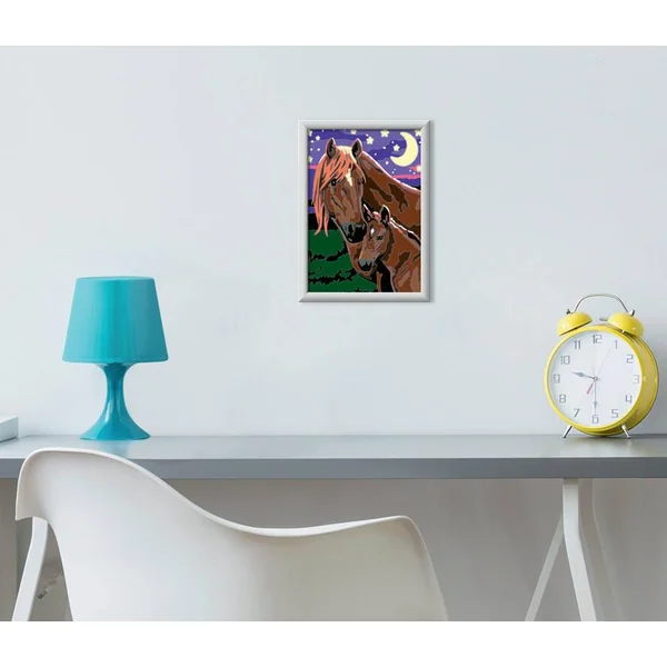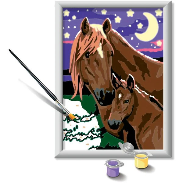 C’est facile, beau et amusant de peindre par numéro grâce aux lignes colorées pré-peintes ! Parmi les 20 visuels petits formats à peindre et à accrocher, cette jument et son poulain à la nuit tombée sauront ravir les enfants et compléter leurs collections. La peinture par numéro est même brillante dans la nuit grâce à l’ajout à la peinture phosphorescente incluse.