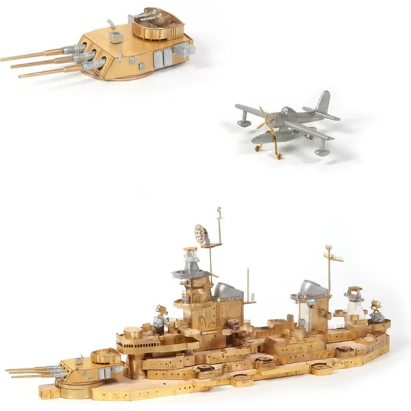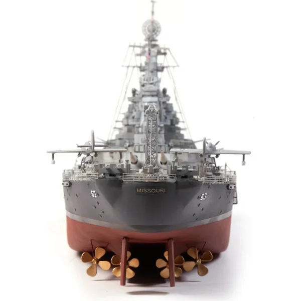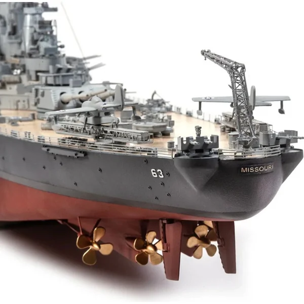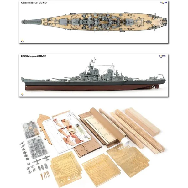 Kit de construction du modèle de bateau OCCRE USS Missouri, à l’échelle 1:200. L’emballage contient des pièces pour la construction – pièces découpées au laser, baguettes, photodécoupes en laiton, cordages et autres. Plans de construction et instructions.