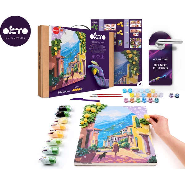 Kit de pâte à modeler auto-durcissante, ensemble de peintures pour la peinture, pinceau. Créez une œuvre d’art unique avec le kit sensoriel 3D Okto ! Combinez la peinture par numéros et la modélisation 3D pour créer un paysage coloré en relief.