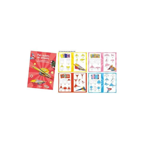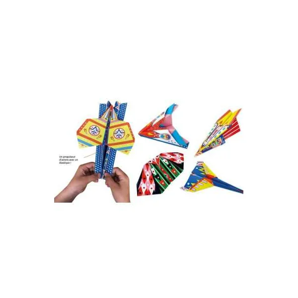 Le coffret contient 20 feuilles d’origami, un propulseur, des autocollants et un livret de pas à pas.