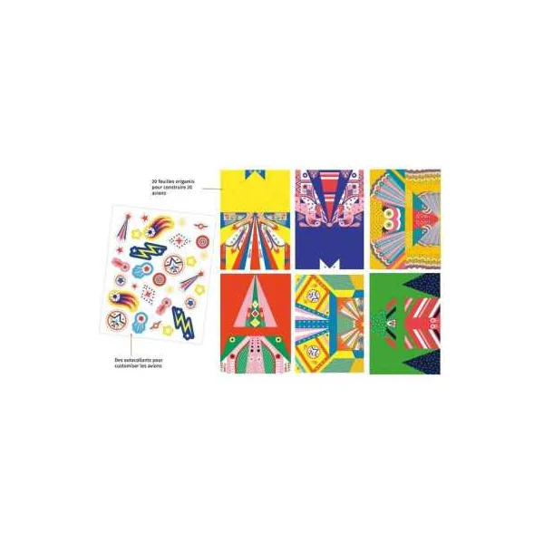 20 feuilles origamis pour construire 20 avions et des autocollants pour les customiser.