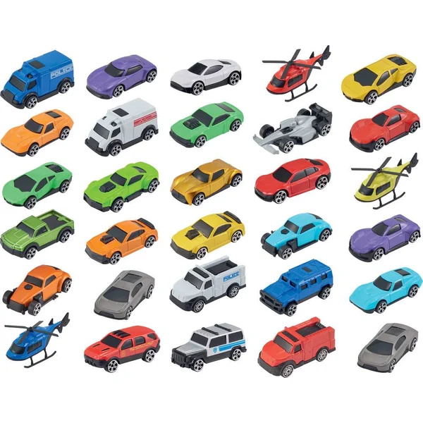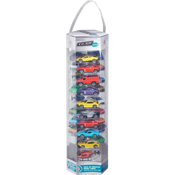 Pack contenant 30 véhicules roues libres Die-Cast : en métal et plastique. Longueur d’un véhicule : environ 7.5 cm. Un ensemble de véhicules à collectionner !