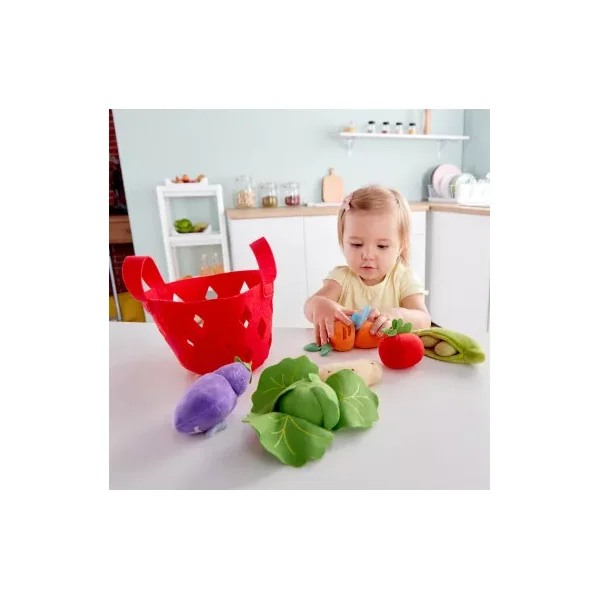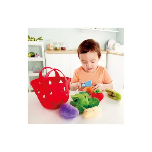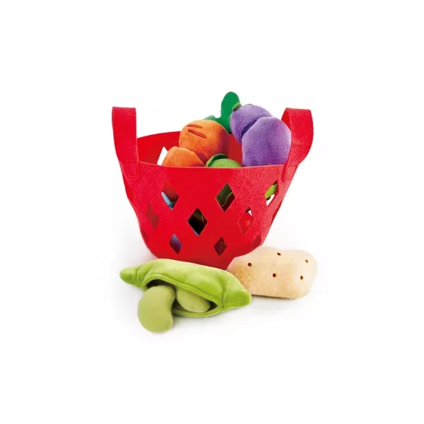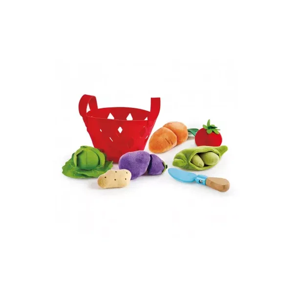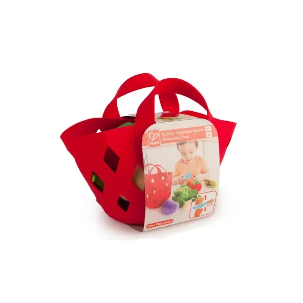 Découvrez le panier de légumes en tissu de Hape, 6 légumes et un couteau dans un panier pour jouer à la dinette à partir de 18 mois. Ce grand panier en feutrine rouge comprend une tomate, une pomme de terre, une carotte et une aubergine à découper, un haricot et un chou à éplucher.