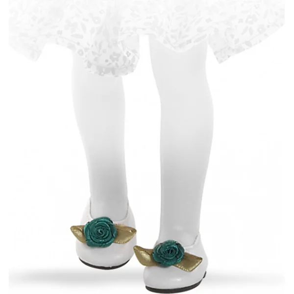 Des ballerines blanches avec un nœud décoratif doré et une rose verte – de jolies chaussures pour une poupée de 32 cm