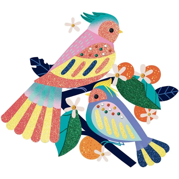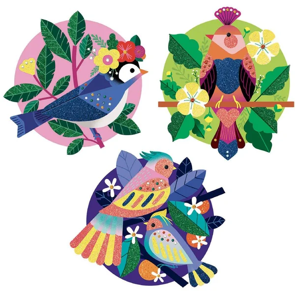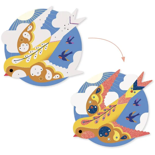 4 tableaux silhouettés en forme de médaillons à illuminer de paillettes et de petits strass. L’enfant place son tableau dans la boîte, dévoile les zones préencollées puis il positionne les strass et saupoudre la poudre pailletée en suivant le code couleurs indiqué dans le livret. Pour exposer ses réalisations, l’enfant fixe les petits crochets de suspension prévus à cet effet au dos des planches. Quelle fierté d’admirer les plumages chamarrés !