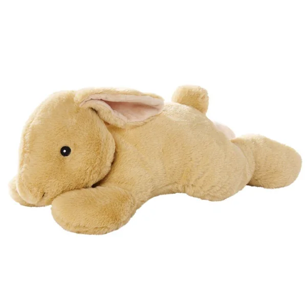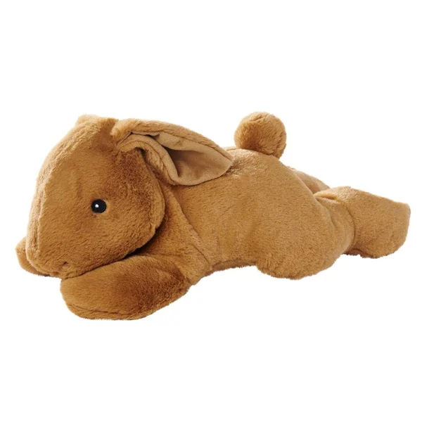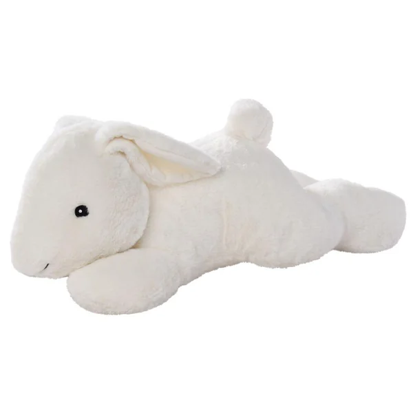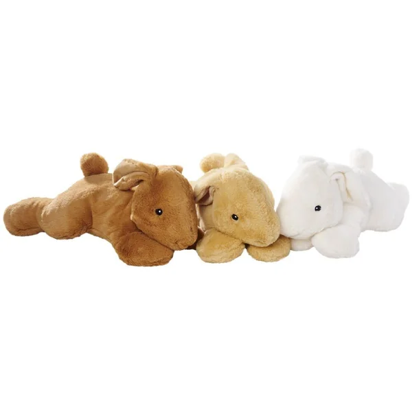 Lapin couché de 50 cm. 3 modèles assortis : blanc, beige ou brun). 100% polyester. Lavage à 30°. Convient dès la naissance.