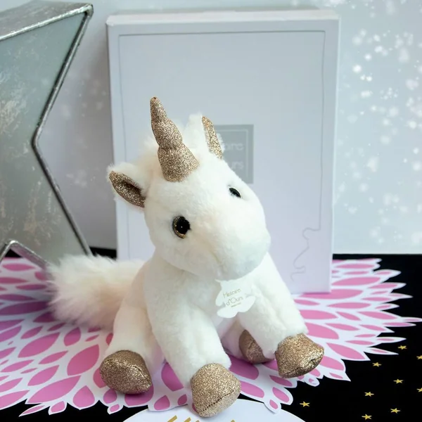 Une peluche qui brille grâce aux paillettes ! Belle peluche licorne couleur blanche et or. Une peluche originale et que l’on ne voit pas partout puisque ses petits sabots, sa corne et ses yeux brillent ! Un regard tendre est aussi très douce, elle deviendra forcément la meilleure amie de votre enfant. Taille : 23 cm. 100% polyester. Lavable en machine à 30°, séchage à l’air libre.Ce produit bénéficie de LA GARANTIE DOUDOU. Grâce à son numéro unique, Doudou perdu est vite retrouvé! Enregistrez votre Doudou et découvrez toutes les garanties sur le site doudouetcompagnie.com.