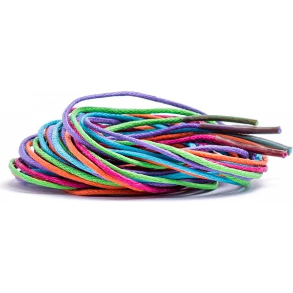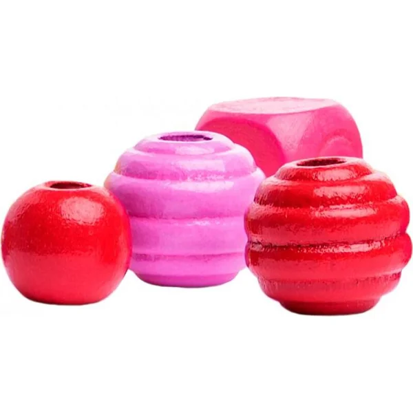 Ce set contient dans un tube en plastique pratique des perles en bois de différentes formes dans des nuances d’orange et de rose. Il comprend également de fins cordons avec des embouts pour le passage.