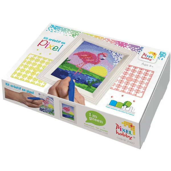 Tableau au numéro tout en pixel et son cadre: Insérer les pixels sur la base en suivant le code couleur fourni,pour créer le dessin.Pas besoin de colle ni de fer à repasser, la fixation est instantanée !Le cadre coloré est inclus pour pouvoir afficher facilement sa création CONTENU DU KIT :23 à 39 couleurs de pixel – 140 carrés de pixel par couleur, 1 modèle à créer, 1 pince en plastique pour atraper les pixels, 1 cadre coloré pour encadre le tableau, 1base à picots 22x15cm