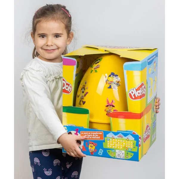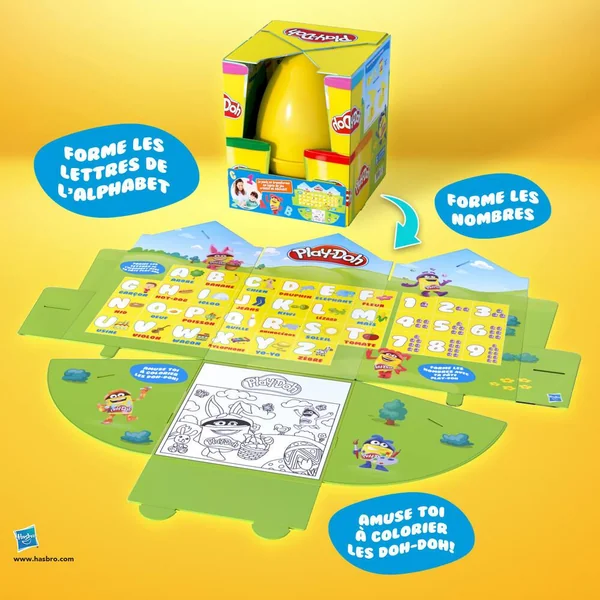 Les enfants pourront s’amuser et laisser libre cours à leur imagination avec l’Œuf de Pâques Play-Doh ! La boîte se transforme en tapis de jeu éducatif et créatif. Ils peuvent aussi modeler les chiffres et les lettres et colorier les adorables Doh-Doh. À l’intérieur, ils trouveront de nombreuses surprises comme les pots de pâte à modeler emblématiques, des emporte-pièces, extrudeurs, moules et accessoires!