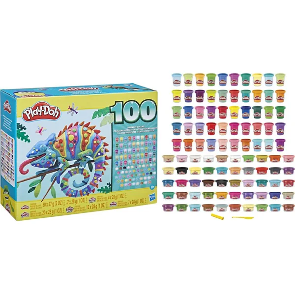 WOW ! 100 pots avec 100 couleurs ! Avec plus de 4 kg de pâte, ce coffret Play-Doh pour enfants (à partir de 3 ans) est parfait pour les activités artistiques à partager. Cette collection de couleur inclut 57 pots de pâte à modeler Play-Doh classique, 36 pots de pâte Play-Doh Paillette, Super scintillante et Éclat Métallique pour faire briller les créations, et 7 pots de pâte Play-Doh Confetti pour transformer chaque création en véritable célébration. Ce coffret est fantastique pour les activités artistiques à partager, les petits cadeaux, la piñata et autres. Avec 100 pots Play-Doh, tout le monde peut se joindre au jeu ! Hasbro, Play-Doh et toutes les marques associées sont des marques de commerce de Hasbro.