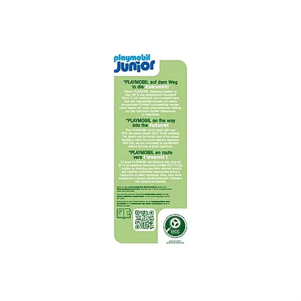 In addition to its safety features, the PLAYMOBIL JUNIOR Shovel Excavator is made with over 90% bio-based plastic, which is ISCC PLUS certified. This commitment to sustainability means that the materials used can be traced back to bio-based feedstock, significantly reducing the reliance on fossil resources. By choosing this playset, you are not only providing your child with a fun and educational toy but also supporting environmentally responsible practices.