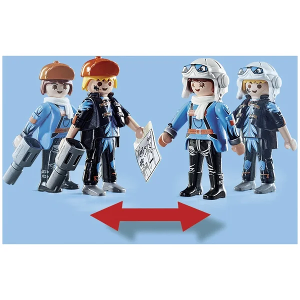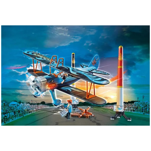 Included in this exciting set are two PLAYMOBIL figures, a double-decker airplane with a rotating propeller and an electronic module, as well as two large pylons complete with bases. The pylons can be easily secured to smooth surfaces using suction cups, allowing for versatile play setups. Additionally, the set comes with tools, scoreboards, and various accessories that enrich the play experience, encouraging children to create their own stunt shows and competitions. This comprehensive playset is designed to inspire creativity and teamwork, making it ideal for solo play or group activities.