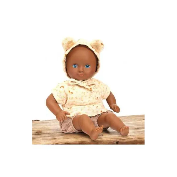 Ce poupon est habillé d’un bloomer, d’une chemise et d’un béguin avec des petites oreilles d’ourson en double gaze 100 % coton.