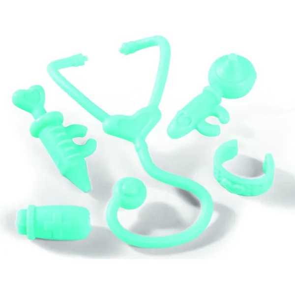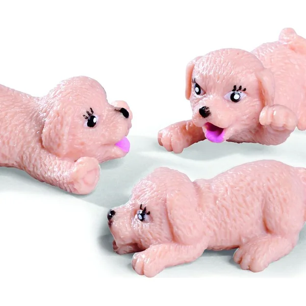 Poupée Evička en tant que vétérinaire avec des lunettes, 3 chiots et une table d’examen.