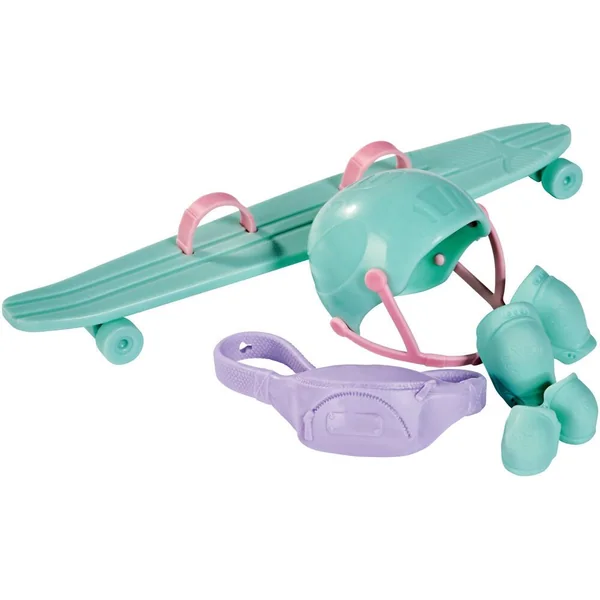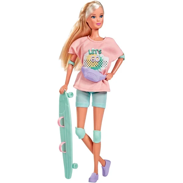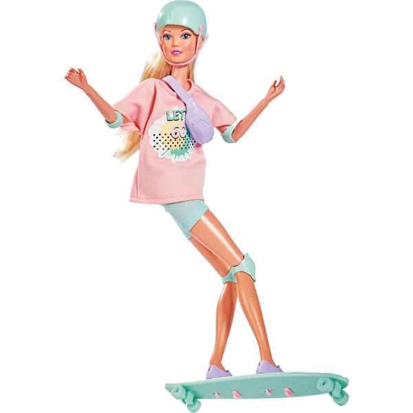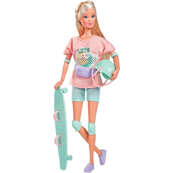 Poupée mannequin de 29cm. Steffi porte une tenue tendance et sportive pour faire du longboard. Elle a un équipement de protection pour genoux, coudes, un casque et un sac banane. Poupée articulée.
