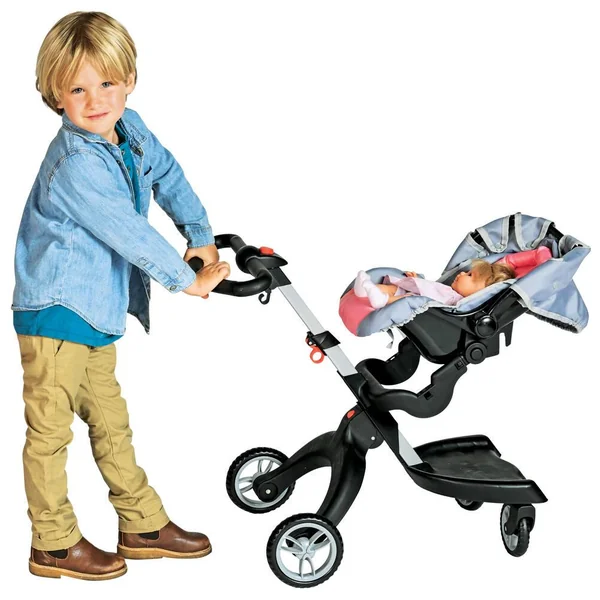Pour poupée jusqu’à 46 cm (non fournie). Facile à manœuvrer, roues avant directrices. Le porte-bébé peut être réglé en position assise ou couchée. Le porte-bébé est amovible : il peut aussi être utilisé comme un siège auto. Réglage facile pour orienter vers l’avant ou vers l’arrière : il suffit de retirer le porte-bébé et de le positionner dans le sens souhaité. La poignée est réglable selon la hauteur de l’enfant : de 41.5 à 78 cm. Siège avec harnais de sécurité. Capote ajustable. Roues silencieuses. Le châssis est pliable et la nacelle amovible : pour un rangement et un transport plus aisés. Facile à assembler. L’assemblage doit être effectué par un adulte. Instructions de montage incluses. Matières : en plastique, tissu (polyester), métal et mousse EVA. Poids net de la poussette : environ 2.9 kg.