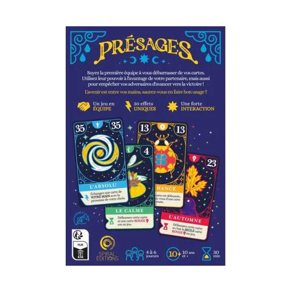 Découvrez le jeu Présages de Spiral Éditions, un jeu de défausse qui se joue en équipe et où chaque décision compte. Un jeu d’affrontement fort en émotions et en rebondissements pour jouer de 4 à 6 joueurs à partir de 10 ans.