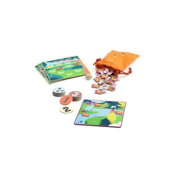 Le coffret comprend 1 dé, 4 plateaux, 60 cartes « Animaux », 20 cartes « Chiffres/Constellations » et 1 sac en tissu.