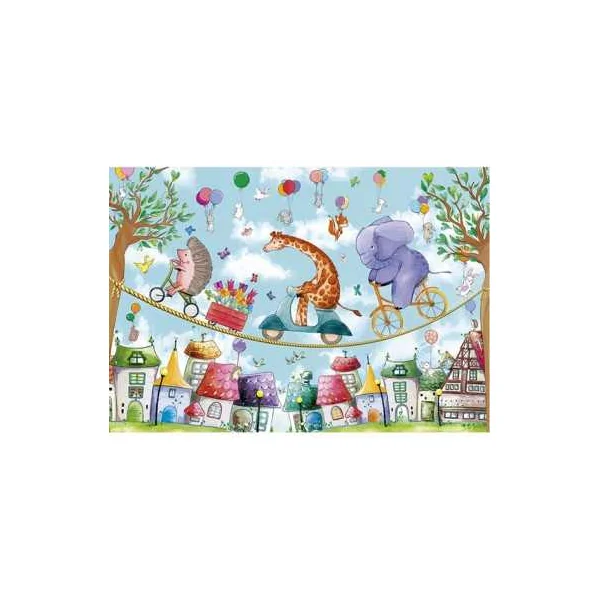 En assemblant les pièces, votre enfant découvrira, au fur et à mesure de l’activité, une scène avec des animaux acrobates et leur petit village.