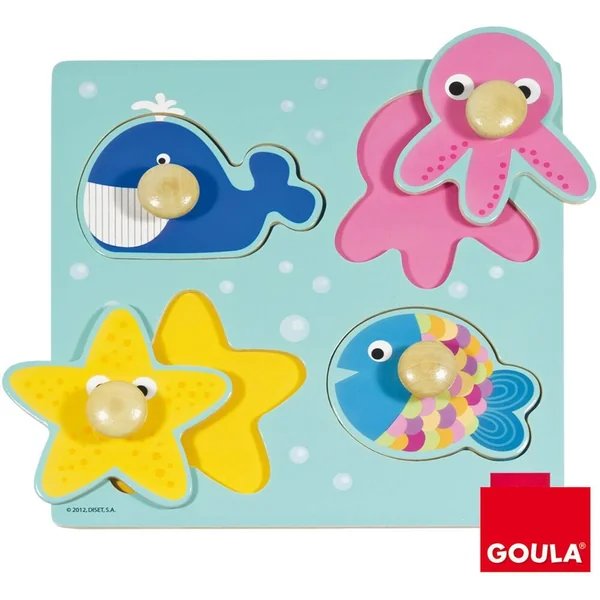 Un premier puzzle d’encastrement en bois de 4 pièces sur la thématique de la mer.